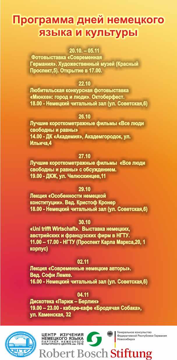 В течение двух недель у жителей нашего города будет возможность посетить фотовыставки «Современная Германия» и «Мюнхен: город и люди», посмотреть лучшие короткометражные фильмы, демонстрировавшиеся на международном фестивале высшей школы кинематографа в Мюнхене в 2007 году. Тематика фильмов - права человека в современном мире. Кроме того, для новосибирцев будет организована лекция «Особенности немецкой конституции» и презентация немецких, австрийских и французских предприятий в Новосибирске, которая пройдет в НГТУ.