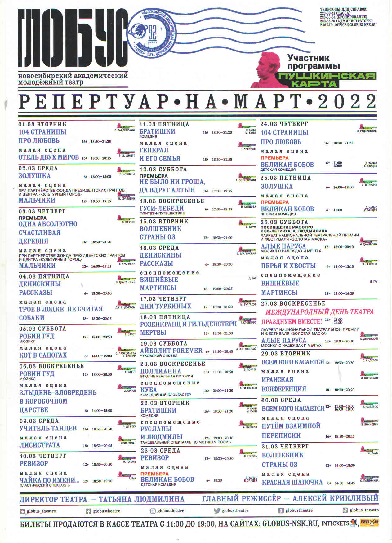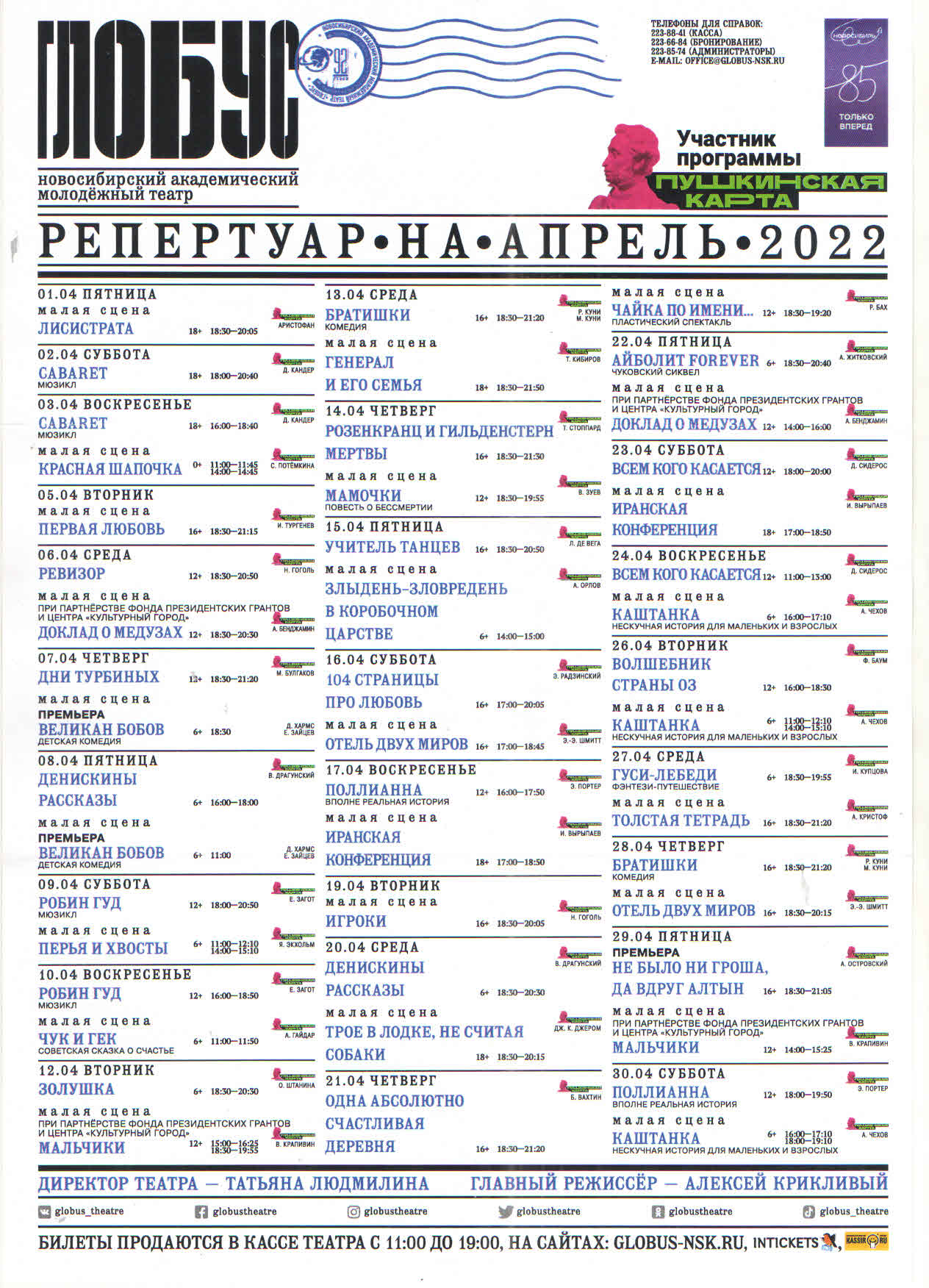 Новосибирский академический театр «Глобус» продолжает свой 92-й театральный сезон и ждет на свои спектакли молодежь — владельцев «Пушкинских карт».
