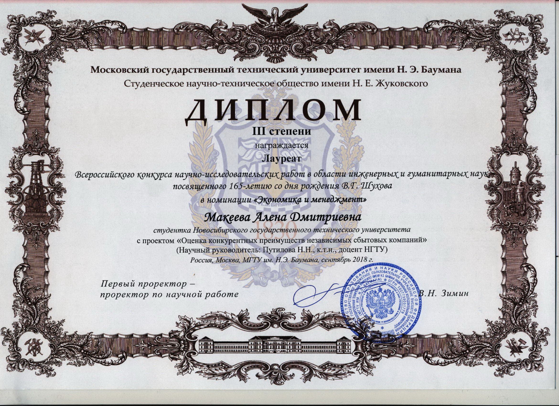 - лауреат III степени в номинации «Экономика и менеджмент» Алена Макеева с научной работой «Оценка конкурентных преимуществ независимых сбытовых компаний». Научный руководитель: к. т. н. доцент кафедры ПМиЭЭ Н. Н. Путилова.
