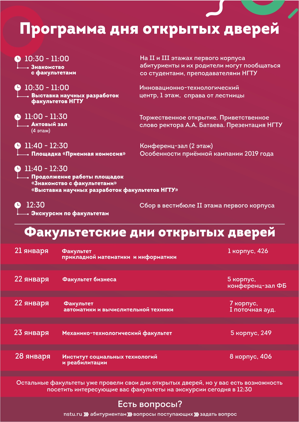 День открытых дверей НГТУ — уникальная возможность лично задать ректору любой вопрос, познакомиться со всеми факультетами и узнать подробные условия поступления в 2019 году.