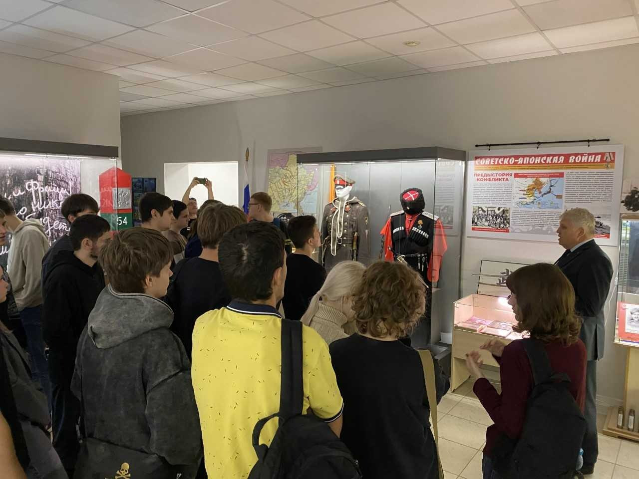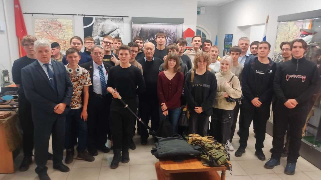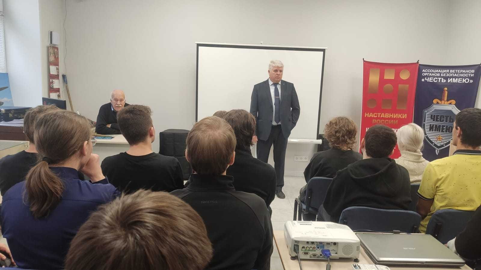 Знакомство студентов с музеем началось с беседы с заслуженным ветераном органов безопасности Олегом Коляденко. Он поделился интересными фактами из своей биографии и затронул темы о служении Родине, месте подвига в современном мире, а также рассказал о современных угрозах, с которыми сталкивается подрастающее поколение.