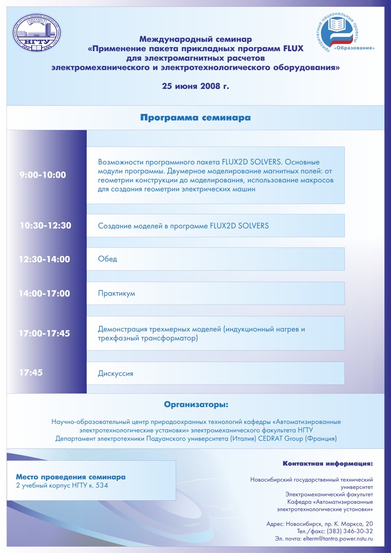 25 июня в НГТУ в рамках реализации Инновационной образовательной программы пройдет Международный семинар «Применение пакета прикладных программ FLUX для электромагнитных расчетов электромеханического и электротехнологического оборудования».