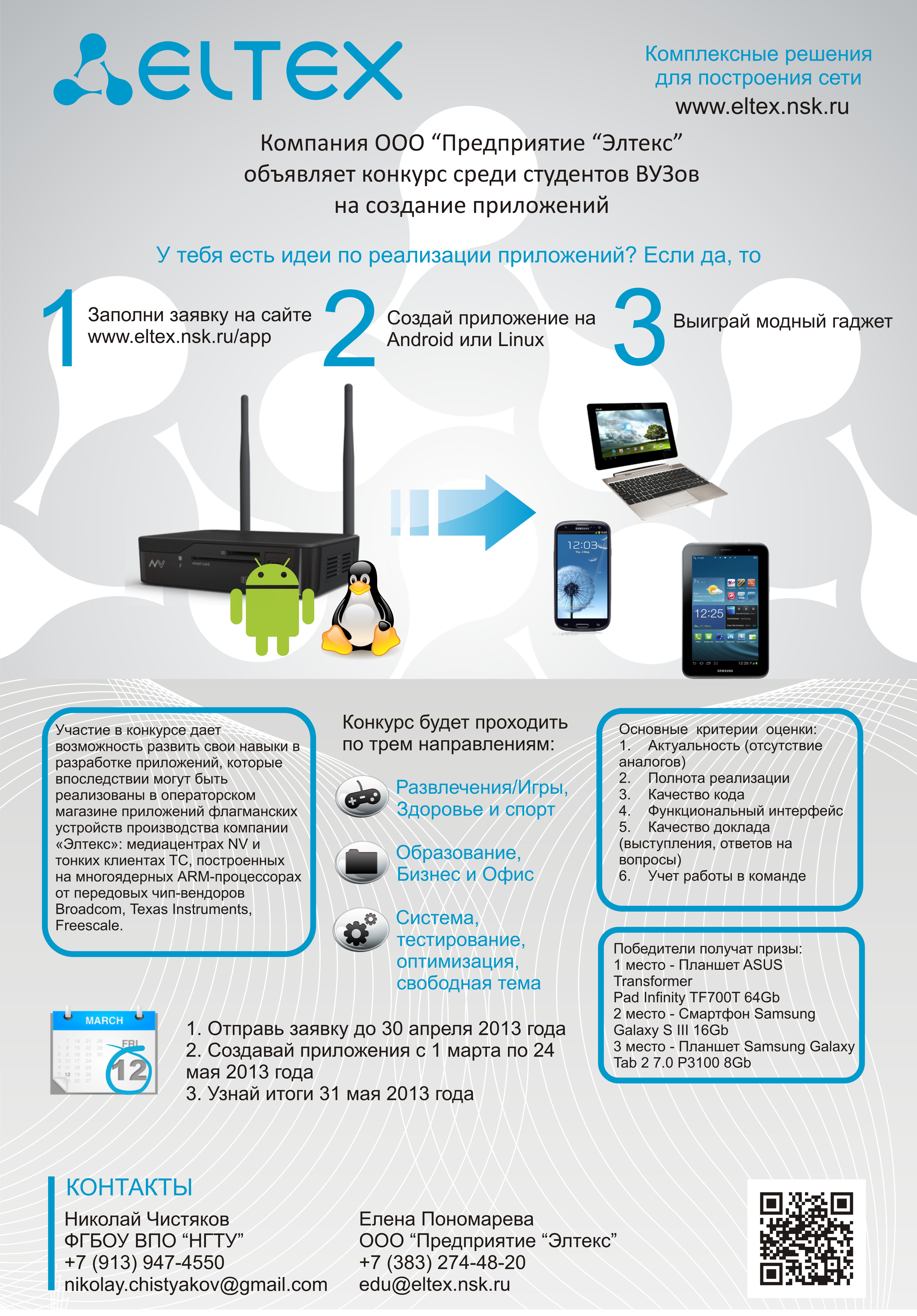 Для участия в конкурсе необходимо до 30 апреля заполнить заявку на участие на сайте компании «Элтекс», разработать проект и создать приложение.