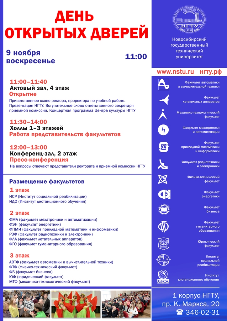 9 ноября (воскресенье) в Новосибирском государственном техническом университете пройдет День открытых дверей для абитуриентов, их родителей, преподавателей школ и средних специальных учебных заведений.